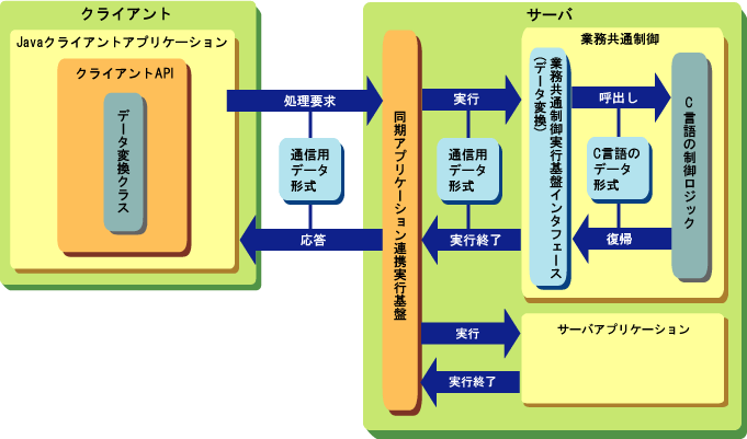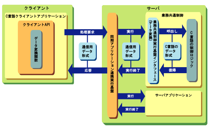 C言語クライアントアプリケーションを開発する場合、業務共通制御実行基盤インタフェース生成ツールは、同期アプリケーション連携実行基盤に配備された制御ロジックをC言語クライアントアプリケーションから呼び出すためデータ変換関数も生成します。