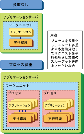 COBOLのアプリケーションなどの理由によりスレッド多重が利用できない場合や特定のスレッドが異常になった場合に他の処理スレッドへ影響を与えたくない場合、該当のアプリケーションを処理するプロセスの多重度を増加させることにより、アプリケーションの処理性能を高めます。なお、プロセス内のスレッドは、スレッドの多重化と併用することができます。