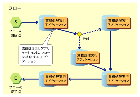 業務処理実行アプリケーションは、フローを構成するCOBOLまたはJavaのアプリケーションです。複数の業務処理実行アプリケーションがフロー定義にしたがって連携動作し、全体で業務処理を行います。