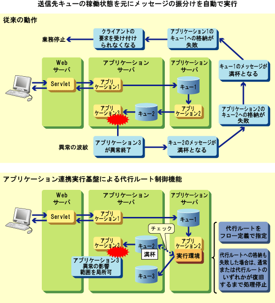 • Javaの業務処理実行アプリケーションの場合、代行ルートのキューも閉塞や満杯となり送信ができなくなった場合、代行ルート制御機能は、代行ルートのキューまたは通常ルートのキューのどちらかが利用可能となるまで待ち続け、どちらかのキューが利用可能となった契機で自動的に業務が再開されます。