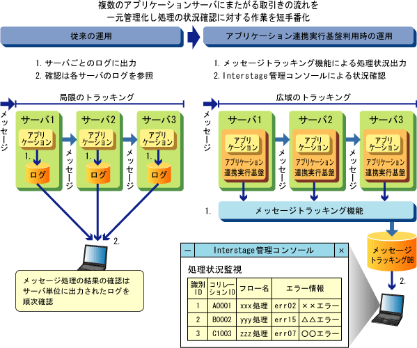 以下に、メッセージトラッキングにおける従来の運用とアプリケーション連携実行基盤での運用を比較した概要図を示します。