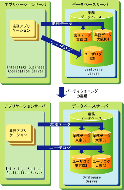 業務データベースがSymfoware Serverのデータベースサーバで、ユーザログテーブルをパーティショニングした例を以下に示します。