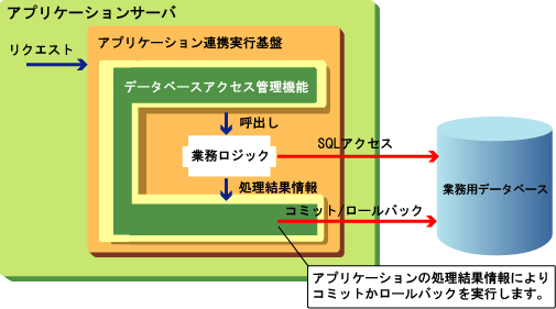 利用者はアプリケーション連携実行基盤で提供された正常または異常といった復帰インタフェースを利用することにより、業務ロジック内で利用した業務用データベースへの操作についても同期してトランザクション制御を行うことができます。