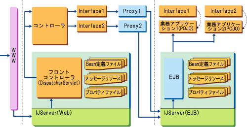 IJServer間連携機能によるSpring Frameworkアプリケーションの構成および呼び出しの流れを以下に示します。