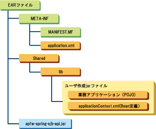 EARファイル配下にShared/libディレクトリを作成し、業務アプリケーションとBean定義ファイルを圧縮したjarファイルを格納します。