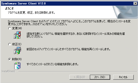 [ようこそ]画面が表示されますので、[削除]を選択し[次へ]ボタンをクリックしてください。