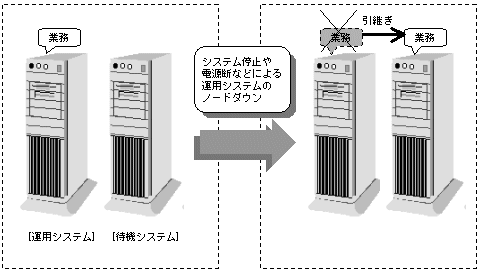 単一システムの場合、現実的には利用者がシステム異常と認識して、処置を行うまでの思考時間が必要ですが、フェイルオーバを利用することにより、システムが自動的な診断結果を元に、システム切替えを促進するため、単一システムと比較してシステムの稼働率が向上します。