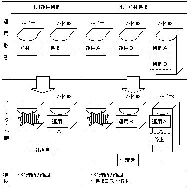 1つのノードで1つのインスタンス(運用または待機)が動作する形態です。この形態は、ノードダウンした場合でも、処理能力の保証が可能なため、信頼性の高いシステムが構築できます。このため、ミッションクリティカルな基幹業務のシステム構築に向いています。