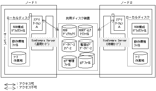 ホットスタンバイ機能を利用した運用を行う場合、ファイルは、共用ディスク装置またはローカルディスクに配置します。Symfoware Serverでは、データベースのように切替え後に運用状態を引き継ぐものは、共用ディスク装置に配置します。運用状態を引き継ぐ必要のないファイルは、ローカルディスクに配置します。共用ディスク装置には、共用ディスクまたは切替えディスクを選択します。