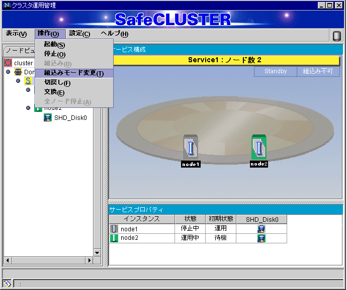 SafeCLUSTER操作メニューで、[クラスタ運用管理]を起動したあと、ナビゲーションエリアのサービスビュー画面で、組込みモードを変更するインスタンスを選択し、メニューの[操作]-[組込みモード変更]を選択します。