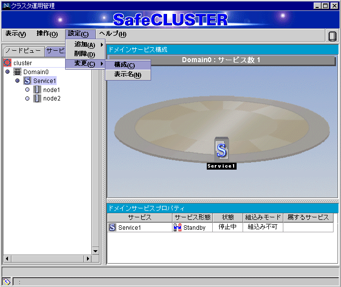 SafeCLUSTER操作メニューで、[クラスタ運用管理]を起動し、ナビゲーションエリアでクラスタサービスの構成を変更したいクラスタサービスを選択し、[設定]-[変更]-[構成]を選択します。