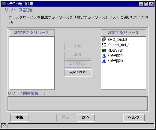 [設定できるリソース]一覧から、クラスタサービスで使用する、RDBシステムおよびアプリケーションなどのリソースを選択し、[設定するリソース]一覧に追加します。