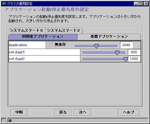 クラスタサービスを構成するアプリケーションが複数からなる場合、[アプリケーション起動/停止優先度の設定]画面が表示されます。起動優先度の変更を行う必要がある場合は、[アプリケーション起動/停止優先度の設定]画面で、アプリケーションの起動順番の優先度の変更を行います。