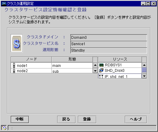 [クラスタサービス設定情報確認と登録]画面で、設定した内容が正しければ、[登録]ボタンをクリックし、設定内容を登録します。