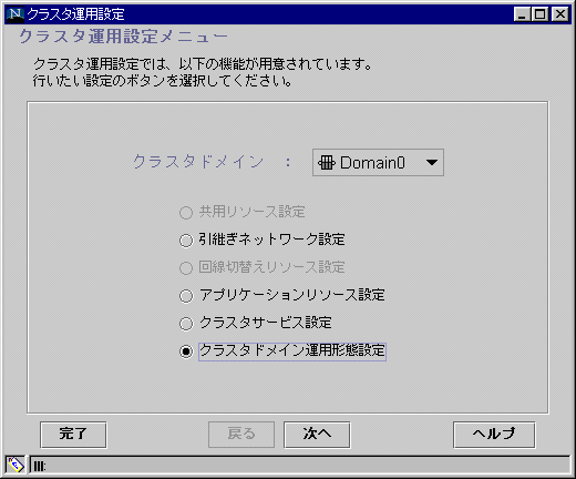 [クラスタ運用設定メニュー]画面で、[クラスタドメイン運用形態設定]ボタンを選択します。