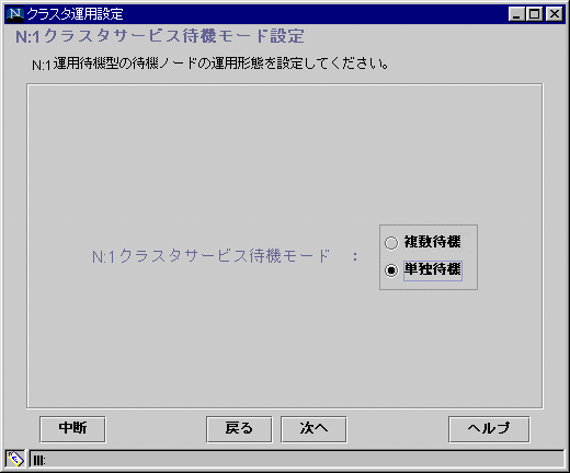 [N:1クラスタサービス待機モード設定]画面で[単独待機]ボタンを選択します。