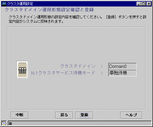 [クラスタドメイン運用形態設定確認と登録]画面で、クラスタドメイン運用形態の設定内容を確認します。設定した内容が正しければ、[登録]ボタンをクリックし、設定内容を登録します。
