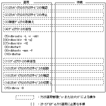 (1)スタンバイクラスのクラスタサービスの状態を ―――― クラスタ管理 確認します。 ビューまたは clgettreeコマンド (sオプション) (2)スタンバイクラスのクラスタサービスの状態が「運用中」―――― クラスタ管理 または「片側運用」のときは、スタンバイクラスの ビューまたは クラスタサービスを停止します。 clstopsvcコマンド (3)媒体障害の場合は、障害ディスクを取り換えます。 ―――― CE作業 ディスク交換後、以下の作業を忘れずに行ってください。 ・パーティション分割 ・NTFSフォーマット(RDBの資源をNTFSファイルに配置している場合のみ) ・論理ドライブ名の設定(RDBの資源をローデバイスに配置している場合のみ) (4)ディスクリソースを活性状態にします。 ディスクリソースの活性手順は、 “5.1.2 ディスクリソースを活性状態にする” を参照してください。 (5)rdbrcvdicコマンドのLOADモードで、RDB ―――― rdbrcvdicコマンド ディレクトリファイルをリカバリします。 ―――― (LOADモードかつ RDBディレクトリファイルのリカバリは、 rオプションかつ インクリメンタルリカバリによるリカバリを推奨します。 ddlオプション) スケーラブルディレクトリ運用の場合 ⇒(6) スケーラブルディレクトリ運用ではない場合 ⇒(8) (6)すべてのユーザロググループ用のRDBディレクトリ ―――― rdbscldirコマンド ファイルを再登録します。 (Aオプションかつ gオプション) (7)すべてのユーザロググループ用のRDB ―――― rdbscldirコマンド ディレクトリファイルが正常に登録されたことを (Vオプション) 確認します。リカバリした以外にアクセス禁止状態の ユーザロググループ用のRDBディレクトリファイルが 存在していた場合は、 “6.2.4 ユーザロググループ用のRDBディレクトリファイルのリカバリ” の(5)と(6)の手順を実施後(8)へ (8)Symfoware/RDBを起動します。 ―――― rdbstartコマンド ホットスタンバイ機能の場合 ⇒(9) スタンバイ機能の場合 ⇒(10) (9)ホットスタンバイ機能の利用の宣言をします。 ―――― rdbhsutyコマンド (RDBディレクトリファイルをリカバリするとホット (monオプションかつ スタンバイ機能の利用で宣言した情報が初期化されるため、 fオプション) ホットスタンバイ機能の利用を再宣言する必要があります。 RDBディレクトリファイルをリカバリする前と同じ内容 を再宣言します。) (10)Symfoware/RDBを停止します。 ―――― rdbstopコマンド (11)ディスクリソースを非活性状態にします。 ディスクリソースの非活性手順は、 “5.1.4 ディスクリソースを非活性状態にする” を参照してください。 (12)スタンバイクラスのクラスタサービスを起動します。 ―――― クラスタ管理 ビューまたは clstartsvcコマンド (13)スタンバイクラスのクラスタサービスの状態を確認 ―――― クラスタ管理 します。 ビューまたは clgettreeコマンド (sオプション) (14)スタンバイクラスのクラスタサービスの状態が ―――― クラスタ管理 「片側運用」のときは、スタンバイクラスのクラスタ ビューまたは サービスを組込みさらに、移動待機なしの場合は、 clchgbldmdコマンド 可能モードに変更し、待機インスタンスに組込みます。 clbldinsコマンド スタンバイクラスのクラスタサービスを切り戻します。 clresumsvcコマンド (15)RDBディレクトリファイルおよびユーザロググループ用の―――― rdbrcvコマンド RDBディレクトリファイルをインクリメンタルリカバリに (Dオプション) よりリカバリした場合は、DSIのアクセス情報をリカバリします。