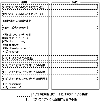 (1)スタンバイクラスのクラスタサービスの状態を ―――― クラスタ管理 確認します。 ビューまたは clgettreeコマンド (sオプション) (2)スタンバイクラスのクラスタサービスの状態が「運用中」―――― クラスタ管理 または「片側運用」のときは、スタンバイクラスのクラ ビューまたは スタサービスを停止します。 clstopsvcコマンド (3)媒体障害の場合は、障害ディスクを取り換えます。 ―――― CE作業 ディスク交換後、以下の作業を忘れずに行ってください。 ・パーティション分割 ・NTFSフォーマット(RDBの資源をNTFSファイルに配置している場合のみ) ・論理ドライブ名の設定(RDBの資源をローデバイスに配置している場合のみ) (4)ディスクリソースを活性状態にします。 ディスクリソースの活性手順は、 “5.1.2 ディスクリソースを活性状態にする” を参照してください。 (5)rdbrcvdicコマンドのFWモードでRDBディクショナリと ―――― rdbrcvdicコマンド RDBディレクトリファイルをリカバリします。 (FWモードかつ RDBディクショナリとRDBディレクトリファイルのリカバリは、 ddlオプション) インクリメンタルリカバリによるリカバリを推奨します。 スケーラブルディレクトリ運用の場合 ⇒(6) スケーラブルディレクトリ運用ではない場合 ⇒(8) (6)すべてのユーザロググループ用のRDBディレクトリファイル―――― rdbscldirコマンド を再登録します。 (Aオプションかつ gオプション) (7)すべてのユーザロググループ用のRDBディレクトリファイル―――― rdbscldirコマンド が正常に登録されたことを確認します。 (Vオプション) リカバリした以外にアクセス禁止状態のユーザロググループ用 のRDBディレクトリファイルが存在していた場合は、 “6.2.4 ユーザロググループ用のRDBディレクトリファイルのリカバリ” の(5)と(6)の手順を実施後(8)へ (8)Symfoware/RDBを起動します。 ―――― rdbstartコマンド ホットスタンバイ機能の場合 ⇒(9) スタンバイ機能の場合 ⇒(10) (9)ホットスタンバイ機能の利用の宣言をします。 ―――― rdbhsutyコマンド (RDBディレクトリファイルをリカバリするとホットスタンバイ (monオプションかつ 機能の利用で宣言した情報が初期化されるため、ホットスタン fオプション) バイ機能の利用を再宣言する必要があります。RDBディレクト リファイルをリカバリする前と同じ内容を再宣言します。) (10)Symfoware/RDBを停止します。 ―――― rdbstopコマンド (11) ディスクリソースを非活性状態にします。 ディスクリソースの非活性手順は、 “5.1.4 ディスクリソースを非活性状態にする” を参照してください。 (12)スタンバイクラスのクラスタサービスを起動します。 ―――― クラスタ管理 ビューまたは clstartsvcコマンド (13)スタンバイクラスのクラスタサービスの状態 ―――― クラスタ管理 を確認します。 ビューまたは clgettreeコマンド (sオプション) (14)スタンバイクラスのクラスタサービスの状態が ―――― クラスタ管理 「片側運用」のときは、スタンバイクラスの ビューまたは クラスタサービスを組込み可能モードに変更し、 clchgbldmdコマンド 待機インスタンスに組込みます。さらに、移動待機、 clbldinsコマンド なしの場合はスタンバイクラスのクラスタサービス clresumsvcコマンド を切り戻します。 (15)RDBディクショナリの退避データを取得します。 ―――― rdbdmpdicコマンド (16)RDBディレクトリファイルおよびユーザロググループ用の ―――― rdbrcvコマンド RDBディレクトリファイルをインクリメンタルリカバリに (Dオプション) よりリカバリした場合は、DSIのアクセス情報をリカバリします。