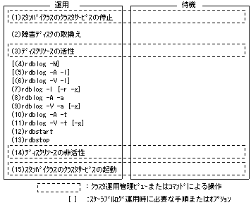 (1)スタンバイクラスのクラスタサービスを停止します。 ―――― クラスタ管理 ビューまたは clstopsvcコマンド (2)媒体障害の場合は、障害ディスクを取り換えます。 ―――― CE作業 ディスク交換後、以下の作業を忘れずに行ってください。 ・パーティション分割 ・NTFSフォーマット(RDBの資源をNTFSファイルに配置している場合のみ) ・論理ドライブ名の設定(RDBの資源をローデバイスに配置している場合のみ) (3)ディスクリソースを活性状態にします。 ディスクリソースの活性手順は、 “5.1.2 ディスクリソースを活性状態にする” を参照してください。 ロググループ管理ファイルとログ管理ファイルを同一の ローデバイスに配置していない場合、または、ロググループ 管理ファイルとログ管理ファイルを同一のディスクに配置し ていない場合、または、スケーラブルログ運用をしていない 場合 ⇒(7) ロググループ管理ファイルとログ管理ファイルを同一の ローデバイスに配置している場合、または、ロググループ 管理ファイルとログ管理ファイルを同一のディスクに配置 している場合 ⇒(4) (4)ロググループ管理ファイルを作成します。 ―――― rdblogコマンド (Mオプション) (5)同一ローデバイス以外のすべてのユーザロググループの ―――― rdblogコマンド ログ管理ファイルを再登録します。 (Aオプションかつ Iオプション) (6)当該ロググループ以外のすべてのロググループのログ管理 ―――― rdblogコマンド ファイルが正常に登録されたことを確認します。 (Vオプションかつ Iオプション) (7)ログ管理ファイルを再作成します。 ―――― rdblogコマンド スケーラブルログ運用ではない場合またはシステムログ (Iオプション) グループの場合 ユーザロググループの場合 (Iオプションかつ rオプションかつ gオプション) (8)すべてのアーカイブログファイルを再登録します。 ―――― rdblogコマンド (Aオプションかつ aオプション) (9)すべてのアーカイブログファイルが正常に登録された ―――― rdblogコマンド ことを確認します。 スケーラブルログ運用ではない場合 (Vオプションかつ aオプション) スケーラブルログ運用の場合 (Vオプションかつ aオプションかつ gオプション) (10)テンポラリログファイルを再登録します。 ―――― rdblogコマンド 同一ローデバイスにテンポラリログファイルを配置している (Aオプションかつ 場合は、そのテンポラリログファイルのリカバリを行います。 tオプション) “6.5 テンボラリログファイルのリカバリ”を参照してください。 (11)テンポラリログファイルが正常に登録されたことを ―――― rdblogコマンド 確認します。スケーラブルログ運用ではない場合 (Vオプションかつ tオプション) スケーラブルログ運用の場合 (Vオプションかつ tオプションかつ gオプション) (12)Symfoware/RDBを起動します。(動作確認) ―――― rdbstartコマンド (13)Symfoware/RDBを停止します。(動作確認) ―――― rdbstopコマンド (14)ディスクリソースを非活性状態にします。 ディスクリソースの非活性手順は、 “5.1.4 ディスクリソースを非活性状態にする” を参照してください。 (15)スタンバイクラスのクラスタサービスを起動します。 ―――― クラスタ管理 ビューまたは clstartsvcコマンド