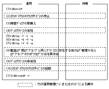 (1)トランザクションの状態(Tran)の“TINH” が無くなるまで待ちます。 ―――― rdbcninfコマンド (2)スタンバイクラスのクラスタサービスを停止します。 ―――― クラスタ管理 ビューまたは clstopsvcコマンド (3)媒体障害の場合は、障害ディスクを取り換えます。 ―――― CE作業 ディスク交換後、以下の作業を忘れずに行ってください。 ・パーティション分割 ・NTFSフォーマット(RDBの資源をNTFSファイルに配置している場合のみ) ・論理ドライブ名の設定(RDBの資源をローデバイスに配置している場合のみ) (4)ディスクリソースを活性状態にします。 ディスクリソースの活性手順は、 “5.1.2 ディスクリソースを活性状態にする” を参照してください。 (5)監査ログ用ロググループのログ管理ファイルを ―――― rdblogコマンド 再作成します。 (Iオプション、 rオプションかつ gオプション) (6)監査ログ用ロググループのテンポラリログファイル ―――― rdblogコマンド を再登録します。 (Gオプション、 tオプションかつ gオプション) (7)監査ログ用ロググループのテンポラリログファイル ―――― rdblogコマンド が正常に再作成されたことを確認します。 (Vオプション、 tオプションかつ gオプション) (8)監査ログ用ロググループと同じデバイスに存在する 他のログ管理ファイルとロググループの テンポラリログファイルを再作成します。 (9)ディスクリソースを非活性状態にします。 ディスクリソースの非活性手順は、 “5.1.4 ディスクリソースを非活性状態にする” を参照してください。 (10)スタンバイクラスのクラスタサービスを起動します。―――― クラスタ管理 ビューまたは clstartsvcコマンド (11)ロールバック不可閉塞の状態の監査ログエレメント ―――― rdbrcvadtコマンド をリカバリします。 (rオプション)