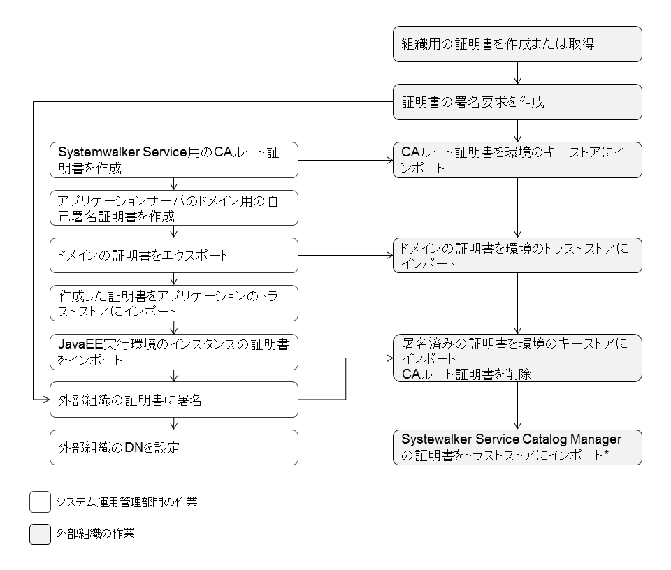 Systemwalker Service Catalog Managerとアプリケーションや外部システムを統合する際に証明書を使用する場合には、開発者担当者は灰色で描かれた作業を行う必要があります。以下の節では、これらの作業の詳細を説明します。システム運用管理部門の作業については、“運用ガイド(システム運用管理部門編)”に記載されています。