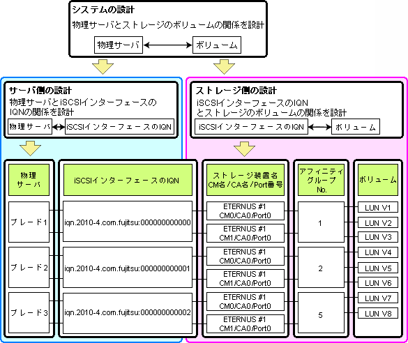 サーバ側では物理サーバとiSCSIアダプターのIQN、ストレージ側ではiSCSIアダプターのIQNとストレージのボリュームとの関係を定義し、システムを設計します。
