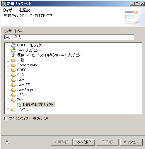 [Web] > [動的 Web プロジェクト]を選択し、[次へ]をクリックしてください。