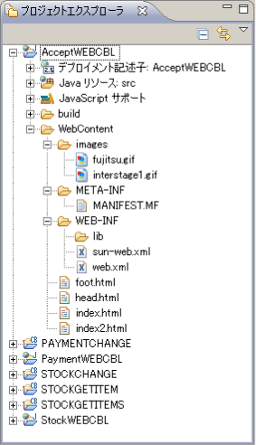 以下に示すWebアプリケーションの資材が、“AcceptWEBCBL”プロジェクトの“WebContent”フォルダに格納されます。