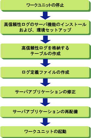 ここでは、高信頼性ログを取得するサーバアプリケーションの運用までの手順を示します。取得した高信頼性ログの退避方法などの運用については、“Interstage Business Application Server 運用ガイド(高信頼性ログ編)”の“ユーザログテーブルの運用”を参照してください。