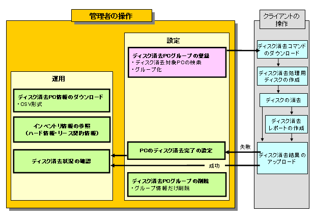 上記流れ図において、「管理者の操作」として黄緑色で表示した部分が、ディスク消去情報管理です。