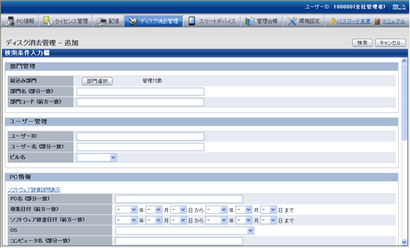 検索対象となるPCの条件を入力し、[検索]ボタンをクリックします。