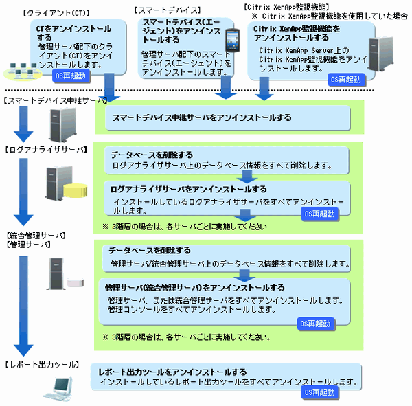 管理サーバ/統合管理サーバにクライアント(CT)を導入している場合に、管理サーバ/統合管理サーバをアンインストールし、再度インストールする場合は、以下の順序で行ってください。この順序で行わない場合は、管理サーバ/統合管理サーバが再度インストールできません。