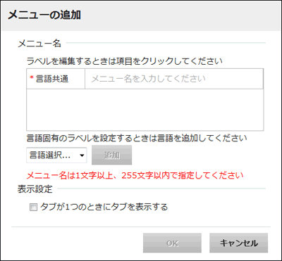 言語共通には、デフォルトのメニュー名を入力します。必ず指定してください。 システムの言語表示に合わせてメニュー名を切り替える場合は、[言語選択]プルダウンメニューから言語を選択して[追加]ボタンをクリックし、言語ごとのメニュー名を入力します。 | |