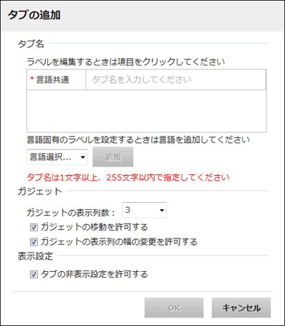 言語共通には、デフォルトのタブ名を入力します。必ず指定してください。 システムの言語表示に合わせてタブ名を切り替える場合は、[言語選択]プルダウンメニューから言語を選択して[追加]ボタンをクリックし、言語ごとのタブ名を入力します。 | |