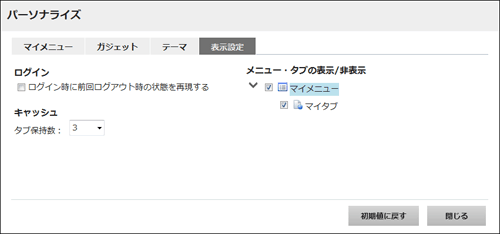メニュー・タブの表示/非設定 | 表示する項目をチェックします。チェックをはずすことで項目を非表示にできます。 |