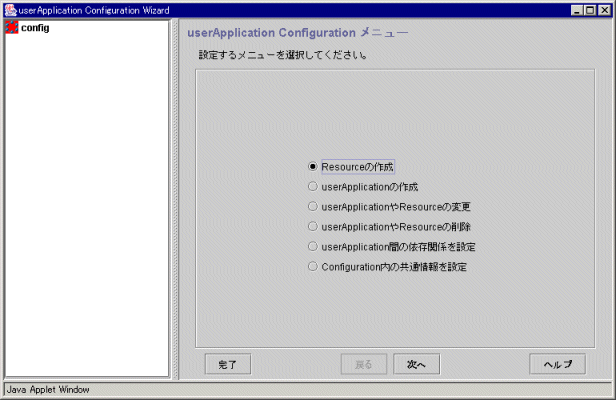 [userApplication Configuration Wizard]画面を起動し、[Resourceの作成]を選択します。