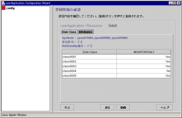 データベーススペースを配置しているディスククラスのMONITORONLY属性を“Yes”に設定します。そのほかの資源についてはMONITORONLY属性を“NO”に設定します。