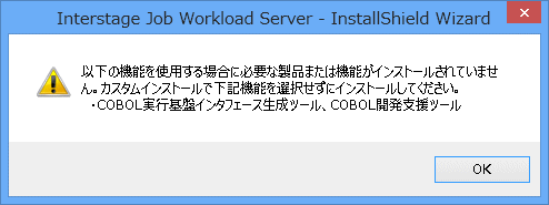 開発環境パッケージのインストールをキャンセルし、Interstage Studioから[アプリケーションサーバ]をインストール後、再度開発環境パッケージをインストールするか、COBOL実行基盤インターフェース生成ツール、およびC言語実行基盤インターフェース生成ツールをインストールしない場合、カスタムインストールで[COBOL実行基盤インターフェース生成ツール、COBOL開発支援ツール]のチェックを外してインストールしてください。