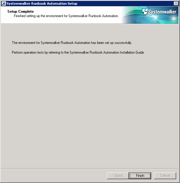 Starting to create an environment for Systemwalker Runbook Automation on the management server. Starting the Process Management Database build... Creating the Process Management Database has completed. Starting to set up the environment for Systemwalker Runbook Automation. Setting up the environment for Systemwalker Runbook Automation has completed. Starting the CMDB environment setup... The CMDB environment setup is now complete. Creating an environment for Systemwalker Runbook Automation on the management server has completed.
