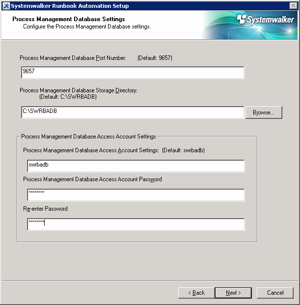 [Enter the account for accessing the Process Management Database] Register a new account, which will be required for Systemwalker Runbook Automation to access the Process Management Database. The value can contain up to 18 alphanumeric characters. If Enter is pressed, the default value will be used. ( default : swrbadb ) ENTER==> [Enter the account password] The value can contain up to 18 alphanumeric characters, spaces and symbols (!#%=~:,_) Account will be registered with the specified password. ENTER==> Re-enter the password. ENTER==>
