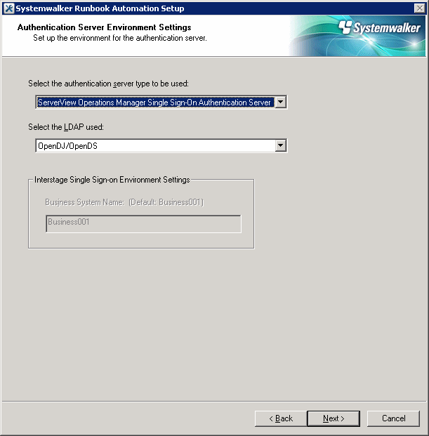 Interstage Single Sign-on Environment Settings | This field is disabled if you selected ServerView Operations Manager Single Sign-On Authentication Server as the type of authentication server to be used. |