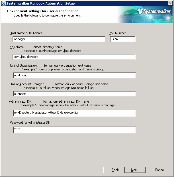 [Enter administrator DN] Enter the administrator DN. (Example: cn=manager,ou=interstage,o=fujitsu,dc=com) If Enter is pressed, the default value will be used. ( default : cn=Directory Manager,cn=Root DNs,cn=config ) ENTER==>
