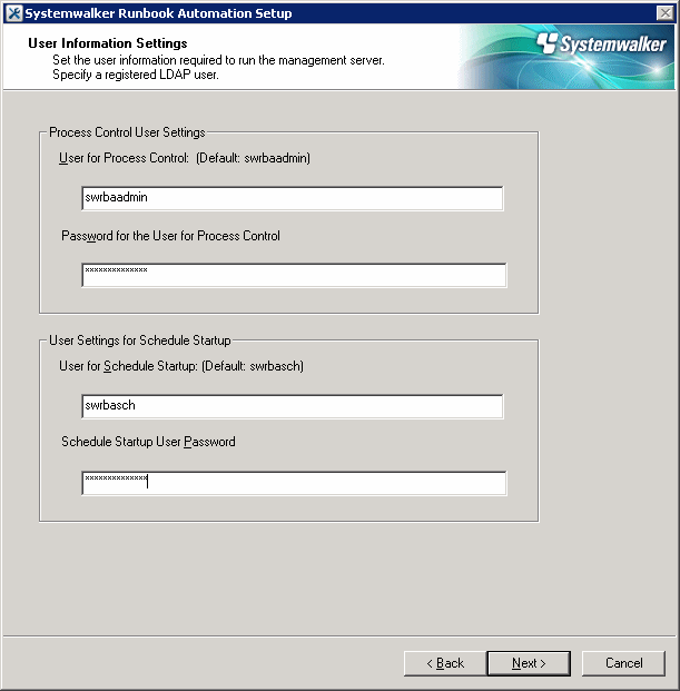 [Enter account for the user for schedule startup] Enter the account for the user for schedule startup. If Enter is pressed, the default value will be used. Or enter "*" to change the information on the LDAP server. ( default : swrbasch ) ENTER==> [Enter password for the user for schedule startup] Enter the password for the user for schedule startup. ENTER==>