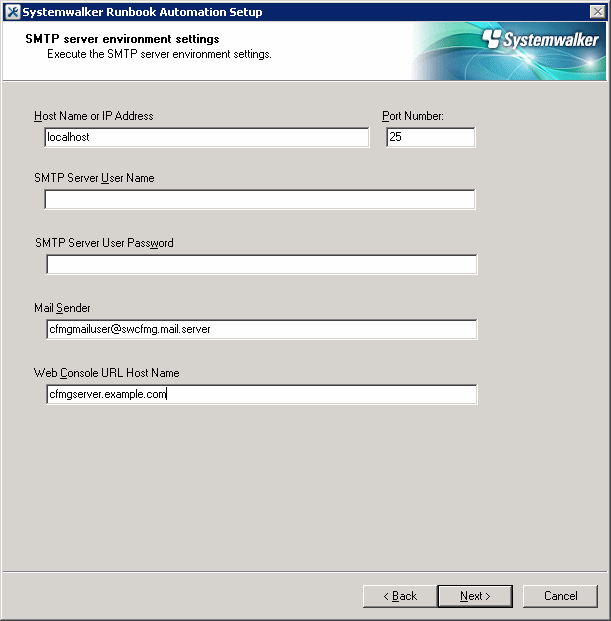 Systemwalker Software Configuration Manager does not use the email function of Systemwalker Runbook Automation. However, you must set values for the following items in accordance with the table above, because item are required for Systemwalker Runbook Automation setup.