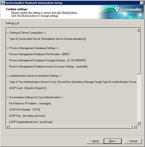 [Confirm setup information] Check the specified values. ================================================================ Systemwalker Runbook Automation operation model Process Management Database directory : /var/opt/FJSVswrbam/SWRBADB Port number for Process Management Database : 9657 Account for Process Management Database : swrbadb Authentication server kind : ServerView Operations Manager Single Sign-On Authentication Server LDAP used : OpenDJ/OpenDS LDAP Host Name : swrba LDAP Port : 1474 LDAP public directory : dc=fujitsu,dc=com LDAP organizational unit name : ou=Group LDAP account storage unit name : ou=users LDAP administrator DN : cn=Directory Manager,cn=Root DNs,cn=config Account for the user for process control : swrbaadmin Account for the user for schedule startup : swrbasch SMTP server host name : localhost SMTP server port : 25 SMTP server user name : Do not use SMTP server authentication. Mail sender : cfmgmailuser@swrba.mail.server Web console URL host name : cfmgserver.example.com Message broker port : 7676 Server function port : 23700 ================================================================ OK? [Start (y), Cancel (n), Rectify (r)] ENTER==>
