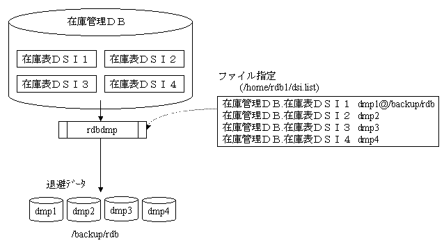 在庫管理DBに属する在庫表DSI1、在庫表DSI2、在庫表DSI3および在庫表DSI4を、/backup/rdbにdmp1、dmp2、dmp3およびdmp4としてバックアップする例を以下に示します。