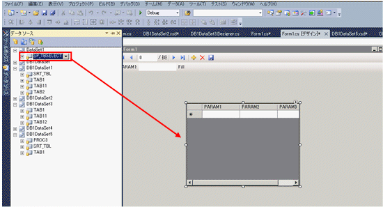 [データソース]画面からDataTableをフォームへドラッグ&ドロップします。