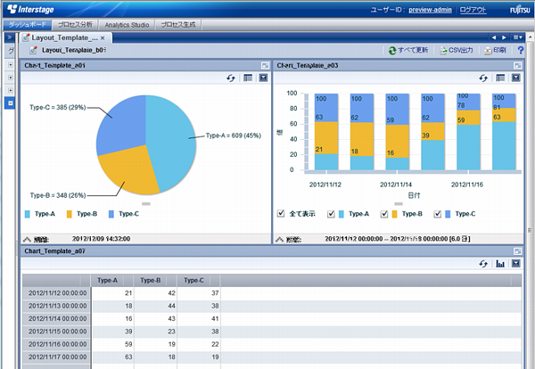部品を使って作成した分析フローを実行します。実行すると、出力データストアに分析結果が出力されます。