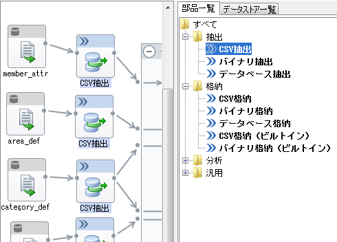 また、各種一覧パネルで部品やデータストアを選択すると、分析フローパネル上の当該部品や当該データストアのノード名称がハイライト表示になります。